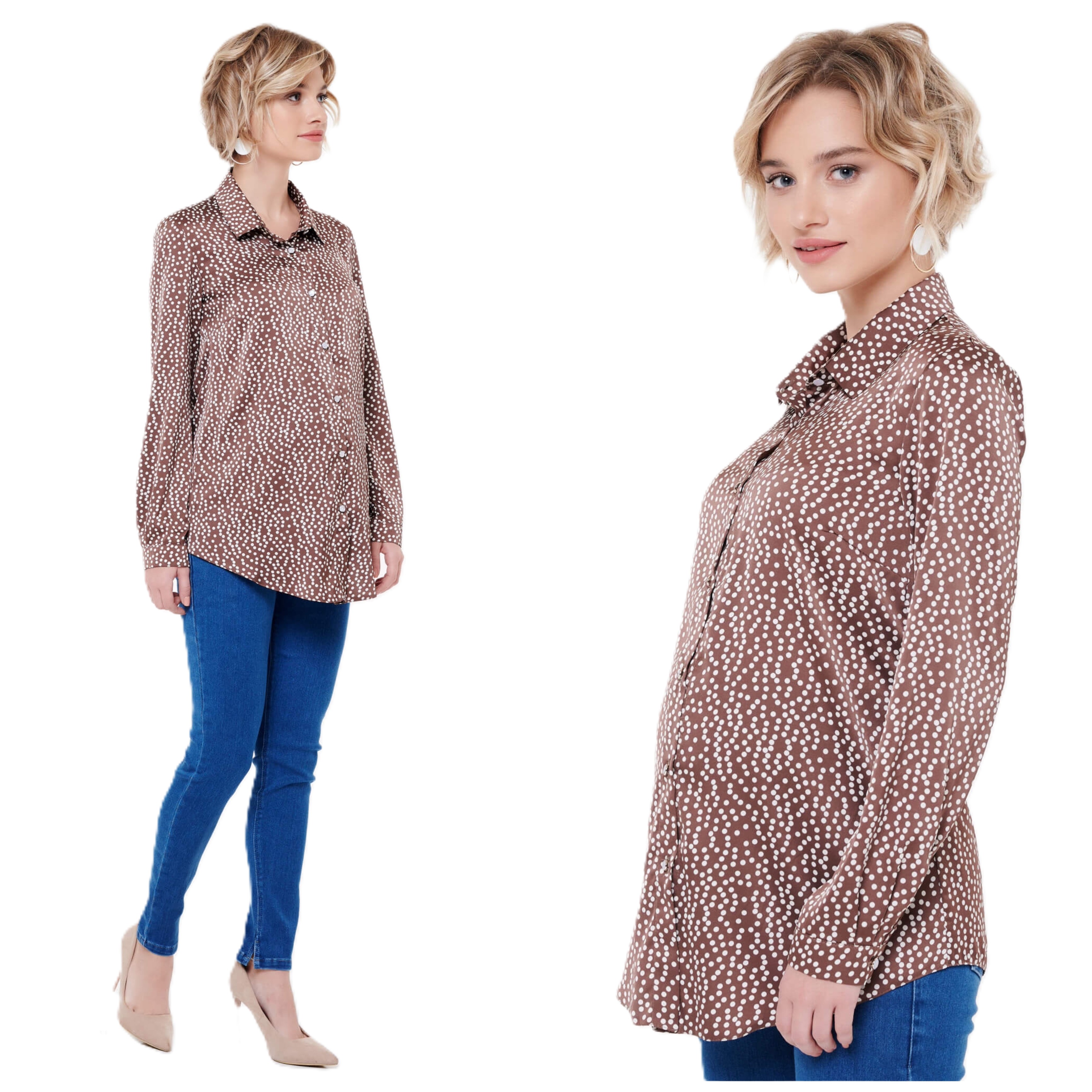 Комфортная легкая блуза для будущих мам и кормящих грудью! Стильный дизайн в модном принте гороха подчеркнет индивидуальность, а удобный крой идеально подойдет женщинам пышных форм (размер 54). Длинные рукава и пуговицы обеспечивают легкость грудного вскармливания без лишних взглядов. Ткань приятна телу, сохраняет тепло и уют. Идеальный выбор для стильного образа во время беременности и кормления малыша! Состав: полиэстер.
