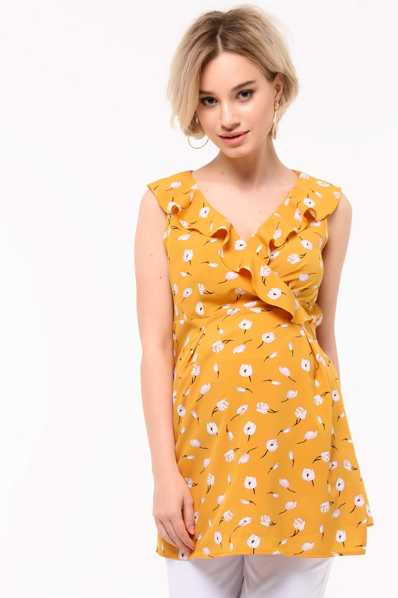 Освещайте каждый день стильной блузой на запах специально созданной для комфорта будущих мам! Вискозная ткань подарит нежное ощущение прохлады, а яркий жёлтый оттенок с очаровательным цветочным узором поднимет настроение. Рюши добавляют элегантности и скрывают особенности фигуры. Разнообразие размеров (52-54) позволяет подчеркнуть индивидуальность каждого силуэта. Идеальный выбор для вашего гардероба – комфорт, красота и удобство сочетаются в одном изделии!