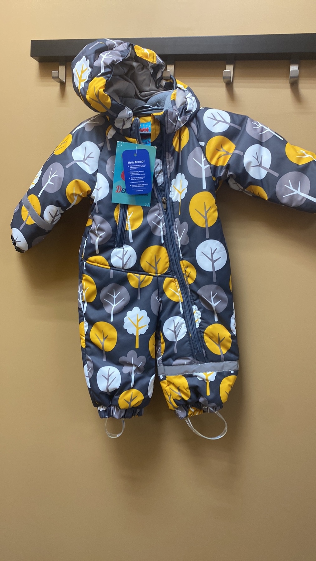 Этот теплый комбинезон  с капюшоном на молнии прекрасно согреет ребенка в мороз до -25* за счет инновационного утеплителя "Hetta" плотностью 250 г/м. Внутри флис для дополнительного тепла.Снаружи материал -мембрана известный тем, что из него шьют одежду для активного спорта.Имеются светоотражательные элементы на рукаве и ножках, также -штрипки- для удобства крепления к обуви.