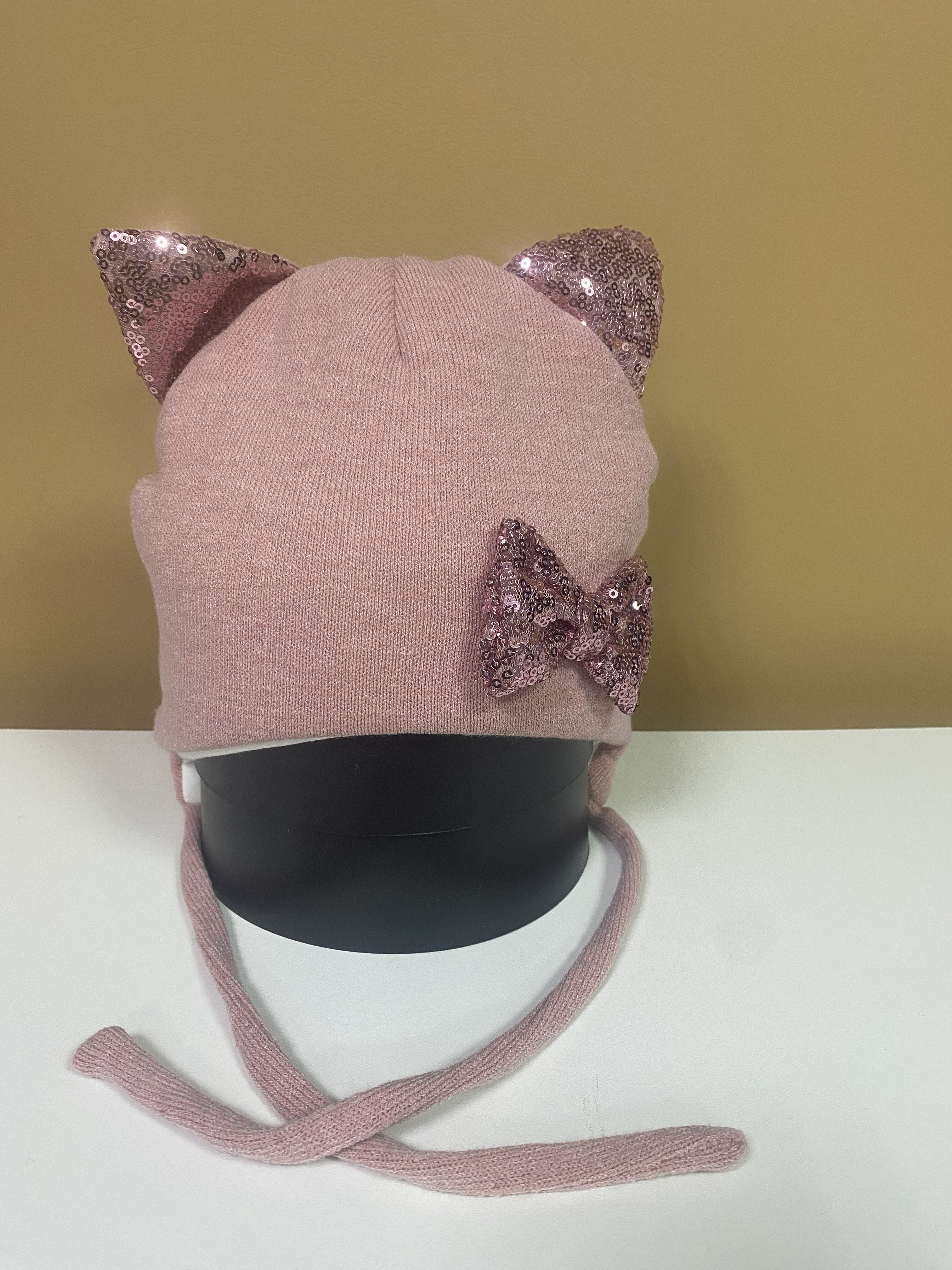 Эта красивая шапочка с ушками и бантом в пайетках несомненно будет украшением вашего ребенка. Верх из теплой шерсти и плотном утеплителе внутри согреет вашего ребенка в холодную зиму. Имеется подкладка их хлопка.